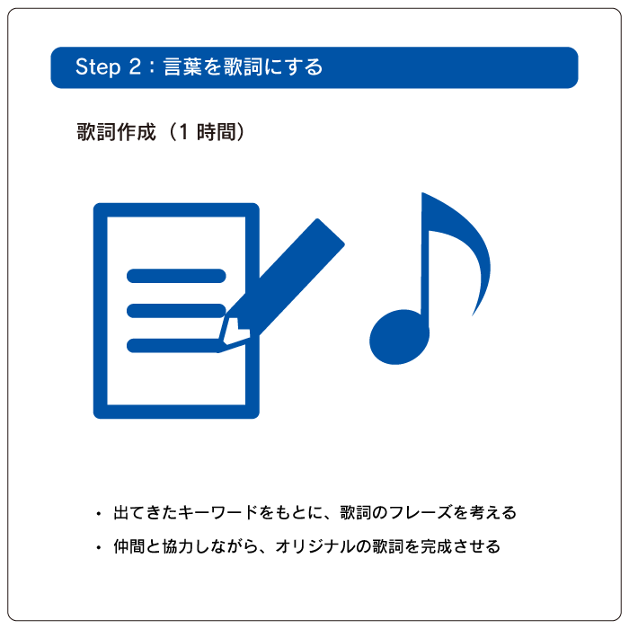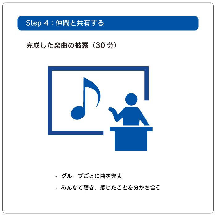 → 最低1グループに1台のパソコン(インターネットの通信環境必須)。プロジェクターやスピーカーなど、完成楽曲が共有できる環境があれば、なお有効です。