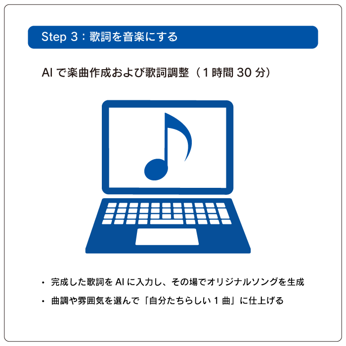 → 歌う必要はなく、歌詞づくりとAI音楽生成がメインなので安心です。